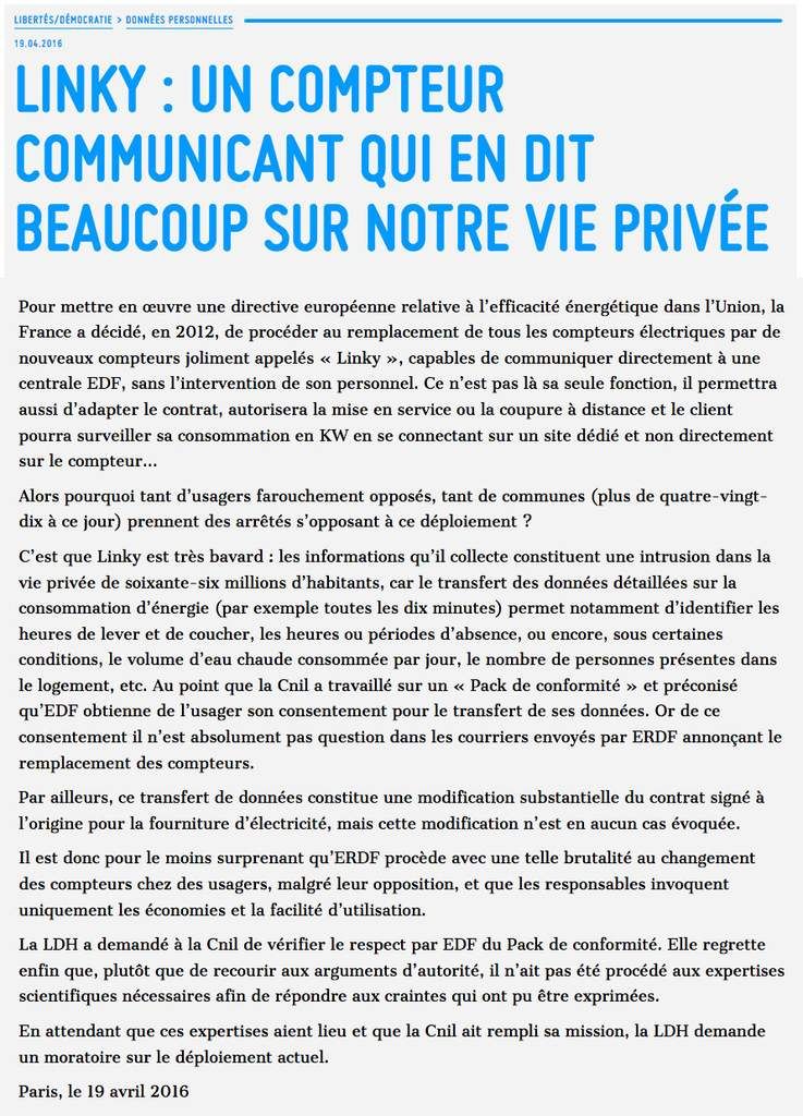 Les collectifs et associations opposés au Linky demandent la levée de ce dispositif discriminatoire ainsi que la restauration d’un service public de l’énergie qui assure aux usagers un accès universel à ce bien commun.